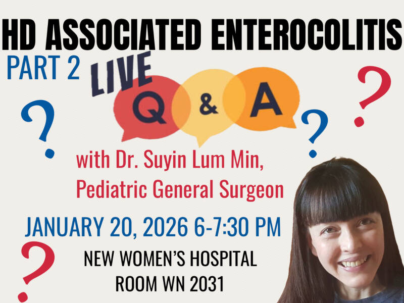 Join us Wednesday, November 26, 2025 from 6-7:30 pm, for PART 2 of HD Associated Enterocolitis. Dr. Lum Min will speak about the pathophysiology, signs and symptoms, how to diagnose and what families can do, regarding this life-threatening complication of Hirschsprung's Disease.